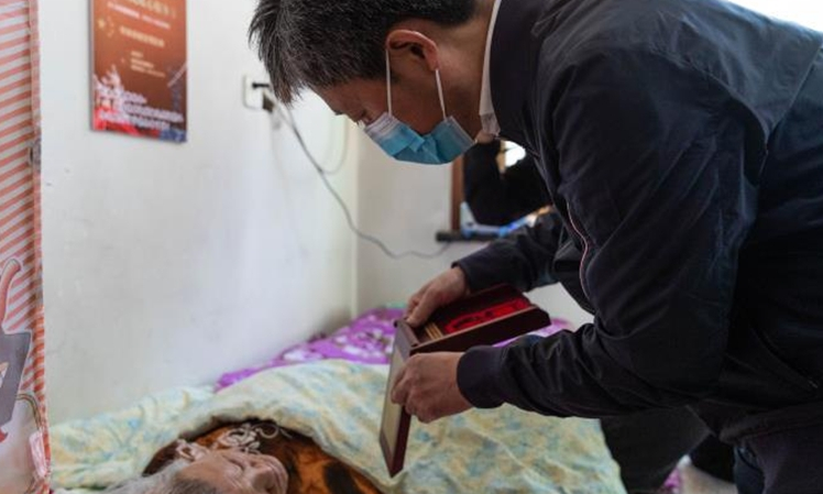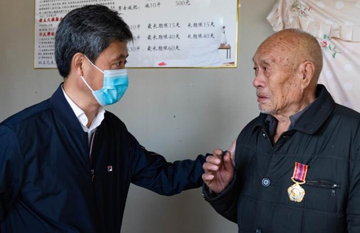 84歲的徐敏老人17歲應(yīng)征入伍,參加過(guò)抗美援朝戰(zhàn)役。他雖然年事已高,但仍然精神抖擻、聲音洪亮。高立春一行來(lái)到徐敏家中,與他親切交談,并送上米、面、油、牛奶等慰問(wèn)品。高立春對(duì)老人投身抗美援朝、經(jīng)歷浴血奮戰(zhàn)的大無(wú)畏精神表示敬意,感謝他們?yōu)樾轮袊?guó)作出的貢獻(xiàn),并親自為他佩戴上“中國(guó)人民志愿軍抗美援朝出國(guó)作戰(zhàn)70周年”紀(jì)念章。同時(shí),高立春還要求相關(guān)部門(mén)和工作人員要時(shí)刻關(guān)心、照顧好老人,及時(shí)主動(dòng)地幫助老人解決生活困難,并叮囑老人有任何困難第一時(shí)間找退役軍人服務(wù)中心這個(gè)“娘家人”。