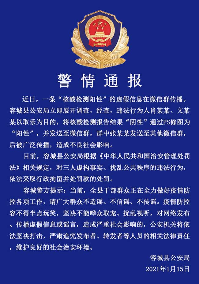 人民網(wǎng)雄安1月15日 (王紅 何美萱)據(jù)雄安新區(qū)容城縣公安局消息,容城縣3人因傳播“核酸檢測(cè)陽(yáng)性”虛假信息被行政拘留并處罰款。