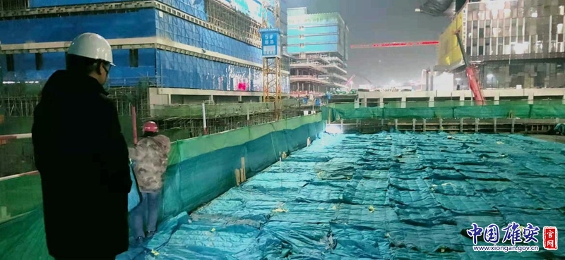 夜間氣溫驟降,雄安商務服務中心項目二標段建設工人給樓面板鋪上棉被進行覆蓋保暖。中建八局供圖