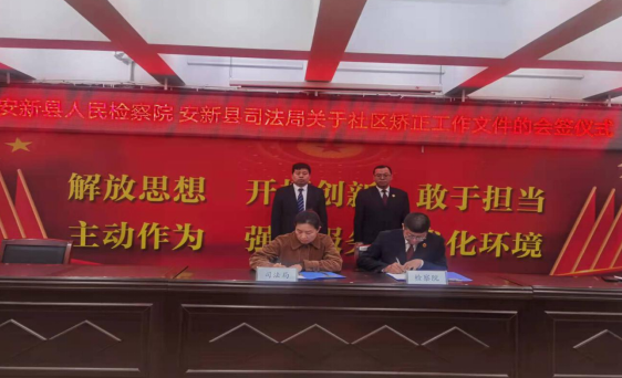為進(jìn)一步規(guī)范社區(qū)矯正工作,加強(qiáng)檢察機(jī)關(guān)與司法行政機(jī)關(guān)協(xié)作配合,實(shí)現(xiàn)監(jiān)管執(zhí)法和法律監(jiān)督工作雙提升,3月18日上午,安新縣人民檢察院聯(lián)合縣司法局舉行社區(qū)矯正工作文件會(huì)簽儀式。安新縣人民檢察院黨組副書記、副檢察長(zhǎng)滕保安、縣政法委副書記、司法局局長(zhǎng)劉麗麗分別代表雙方單位會(huì)簽了《安新縣社區(qū)矯正對(duì)象外出管理辦法》《關(guān)于進(jìn)一步加強(qiáng)安新縣未成年人社區(qū)矯正工作配合協(xié)作的實(shí)施辦法》。安新縣委常委、政法委書記杜建強(qiáng)、縣院黨組書記、檢察長(zhǎng)焦國(guó)宏出席會(huì)簽儀式。