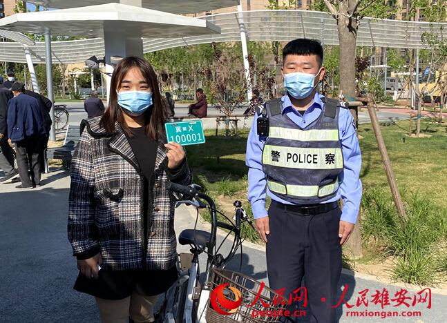 人民網(wǎng)雄安5月1日電 (劉師豪)今天上午,在雄安新區(qū)容東片區(qū)明珠園小區(qū)東側(cè)的電動(dòng)自行車(chē)登記服務(wù)點(diǎn),王志偉領(lǐng)到了屬于自己的號(hào)牌。這也是該服務(wù)點(diǎn)發(fā)放的第一張電動(dòng)自行車(chē)號(hào)牌。