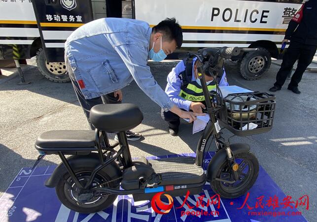 容東片區(qū)服務(wù)點(diǎn)的民警正在查驗(yàn)群眾的電動(dòng)自行車(chē)。人民網(wǎng) 劉師豪攝