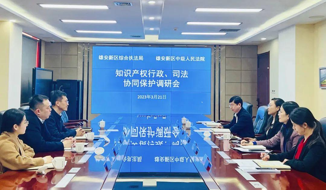 為落實河北省市場監(jiān)督管理局、河北省高級人民法院聯(lián)合印發(fā)的《關于落實強化知識產權協(xié)同保護意見的通知》要求,積極營造雄安新區(qū)穩(wěn)定公開透明、可預期的法治化營商環(huán)境,3月21日、22日,雄安新區(qū)中級人民法院與雄安新區(qū)綜合執(zhí)法局副局長李聰一行、中國(河北)知識產權保護中心張陽主任一行就知識產權司法行政協(xié)同保護開展了調研座談,旨在強化雄安新區(qū)知識產權司法機關與行政保護部門的協(xié)作配合機制,提升協(xié)同保護力度,為優(yōu)化雄安新區(qū)市場經濟環(huán)境貢獻知識產權智慧。