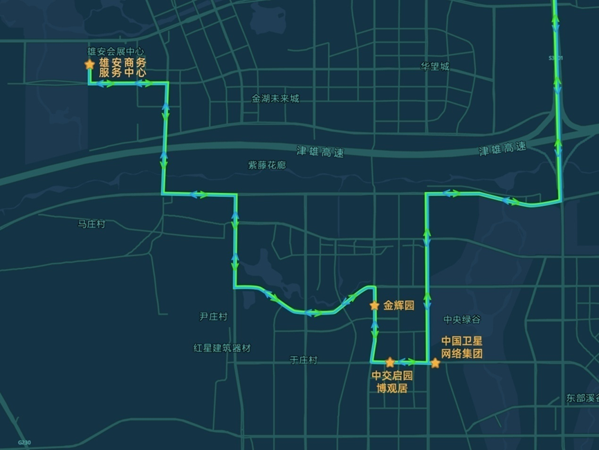 雄安新區(qū)設置4個上下客站點,從雄安商服中心站始發(fā),途經(jīng)博觀居站、金輝園站、中國星網(wǎng)站。