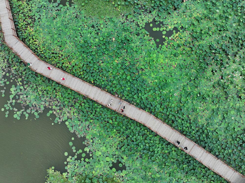 游人在雄安新區(qū)白洋淀荷花大觀園內(nèi)游覽(2024年7月9日攝,無(wú)人機(jī)照片)。新華社記者 牟宇 攝