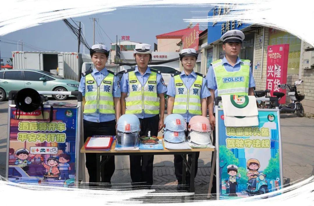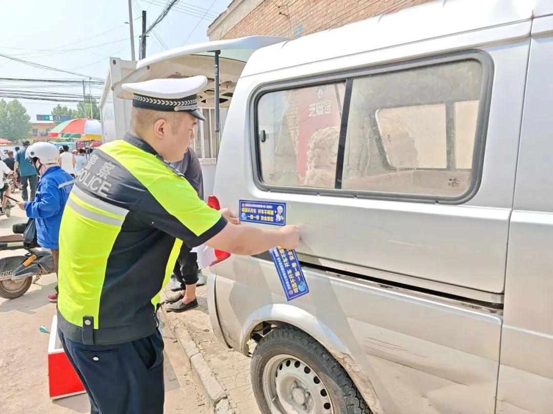 穿梭在集市車流中,民警為來往車輛貼上醒目標(biāo)語:“喝酒不開車,開車不喝酒;一盔一帶,安全常在”。