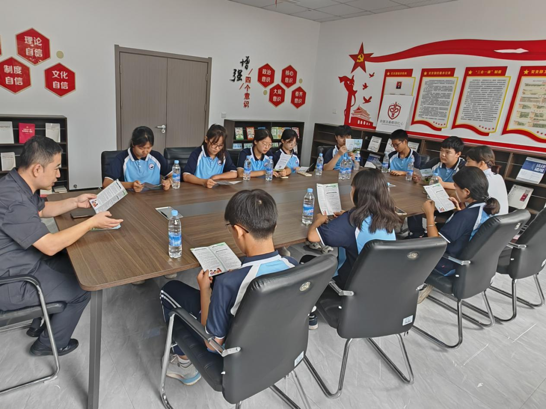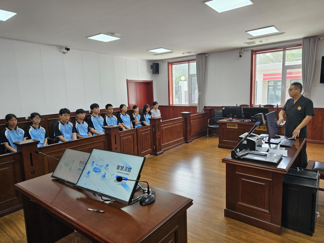 老師和學(xué)生們參觀了安檢室、信訪接待室、調(diào)解室、訴訟服務(wù)中心,負(fù)責(zé)人郭智輝介紹法庭黨建和審判融合工作開展情況,如何以“黨建紅”引領(lǐng)“法治藍(lán)”,以司法裁判為“盾”筑牢法律底線,老師和學(xué)生們對(duì)黨建和審判融合工作有了深入的了解。