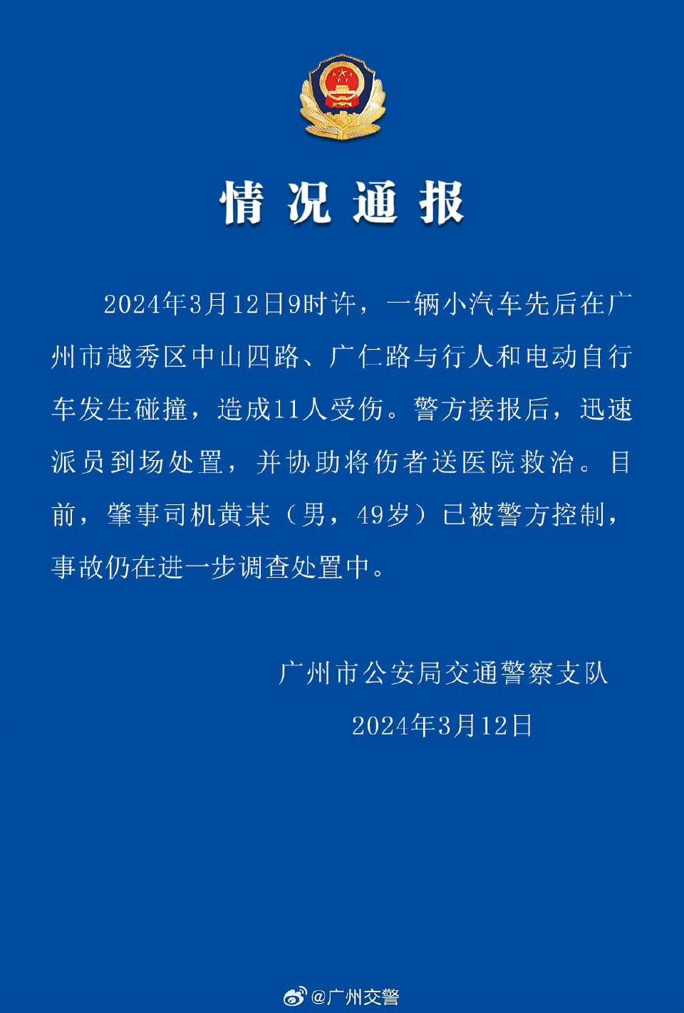 據(jù)“廣州交警”官方微博通報,3月12日9時許,一輛小汽車先后在廣州市越秀區(qū)中山四路、廣仁路與行人和電動自行車發(fā)生碰撞,造成11人受傷。警方接報后,迅速派員到場處置,并協(xié)助將傷者送醫(yī)院救治。目前,肇事司機黃某(男,49歲)已被警方控制,事故仍在進一步調(diào)查處置中。