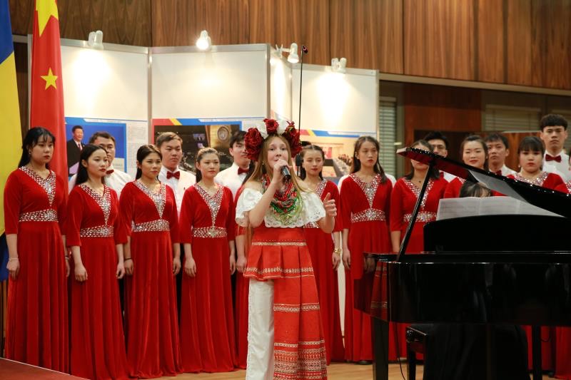 招待會(huì)在中國(guó)留學(xué)生藝術(shù)團(tuán)合唱隊(duì)用中烏雙語演唱的兩國(guó)國(guó)歌聲中拉開帷幕,現(xiàn)場(chǎng)觀眾對(duì)此報(bào)以熱烈掌聲,從一開始就把招待會(huì)氣氛推向了高潮。