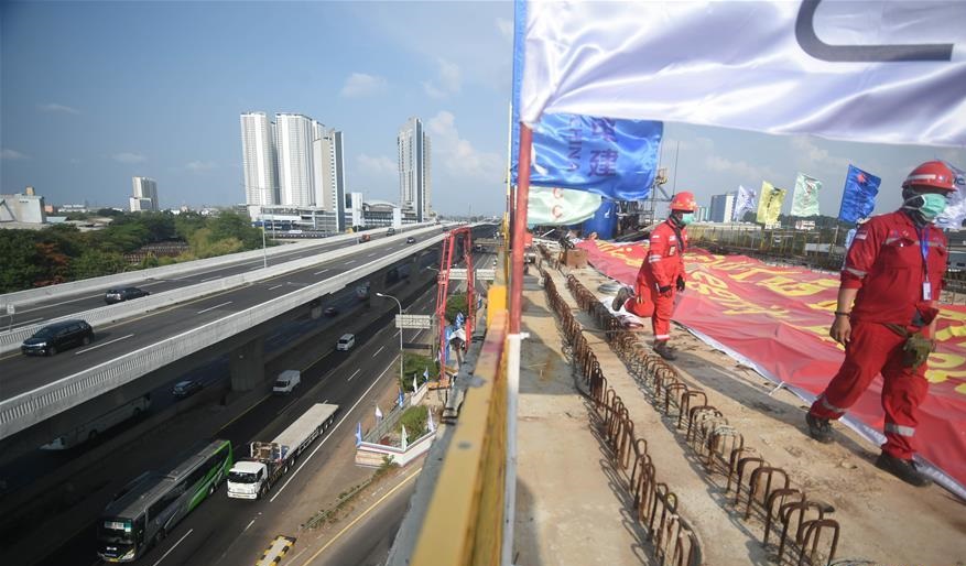8月15日, 在印度尼西亞勿加泗,工人在印尼雅萬高鐵項目一處連續(xù)梁上行走。 印尼雅萬高鐵項目1號梁場雅加達(dá)至萬隆方向架梁通道上的控制性工程-DK29處100米跨剛構(gòu)連續(xù)梁于15日下午順利合龍,標(biāo)志著全線首個架梁通道的形成,為首個架梁段連續(xù)架梁創(chuàng)造了條件。 新華社發(fā)(祖卡南攝)