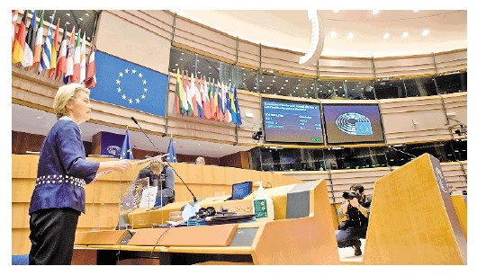 “2021年將是科技巨頭的監(jiān)管年。它們現(xiàn)在已經(jīng)是一個成熟的行業(yè)了,而不再只是閃閃發(fā)光的年輕創(chuàng)業(yè)公司。”美國戰(zhàn)略與國際問題研究中心高級副總裁、技術(shù)政策項目主任詹姆斯·安德魯·劉易斯評論說:“我們過去常說,銀行‘大而不能倒’,但銀行其實受到高度監(jiān)管?,F(xiàn)在,對這些科技巨頭的監(jiān)管也應(yīng)朝著這個方向發(fā)展?!?br/> 歐盟今年2月啟動《數(shù)字服務(wù)法案》和《數(shù)字市場法案》立法工作。歐盟領(lǐng)導(dǎo)人就此進行了數(shù)輪磋商。12月15日,歐盟委員會公布了《數(shù)字服務(wù)法案》及《數(shù)字市場法案》草案。圖①為歐盟委員會領(lǐng)導(dǎo)人及法、德等歐洲主要國家領(lǐng)導(dǎo)人在布魯塞爾進行磋商。圖②為歐盟委員會主席馮德萊恩。