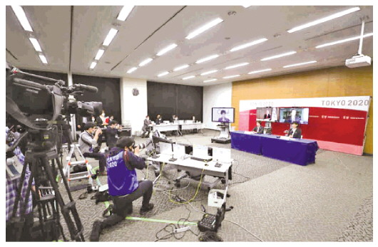 圖為東京奧組委3月舉行五方視頻會議現(xiàn)場。 新華社記者 杜瀟逸 攝