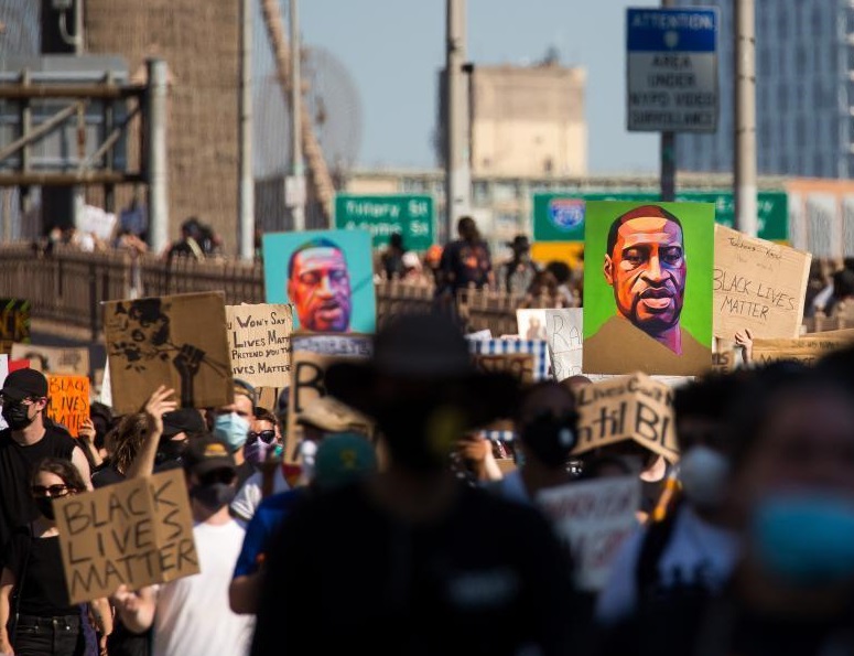 2020年6月9日,人們?cè)诿绹~約街頭參加抗議警察暴力執(zhí)法導(dǎo)致喬治·弗洛伊德死亡的示威活動(dòng)。明尼蘇達(dá)州非洲裔男子弗洛伊德2020年5月遭白人警察暴力執(zhí)法后窒息死亡,引發(fā)全美大規(guī)??棺h。