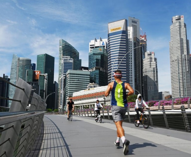 4月14日,一名市民在新加坡金禧橋上跑步。