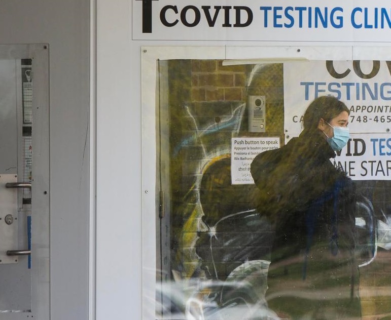 4月22日,在加拿大多倫多的一處新冠病毒檢測點(diǎn),一名戴口罩的女子等候檢測。