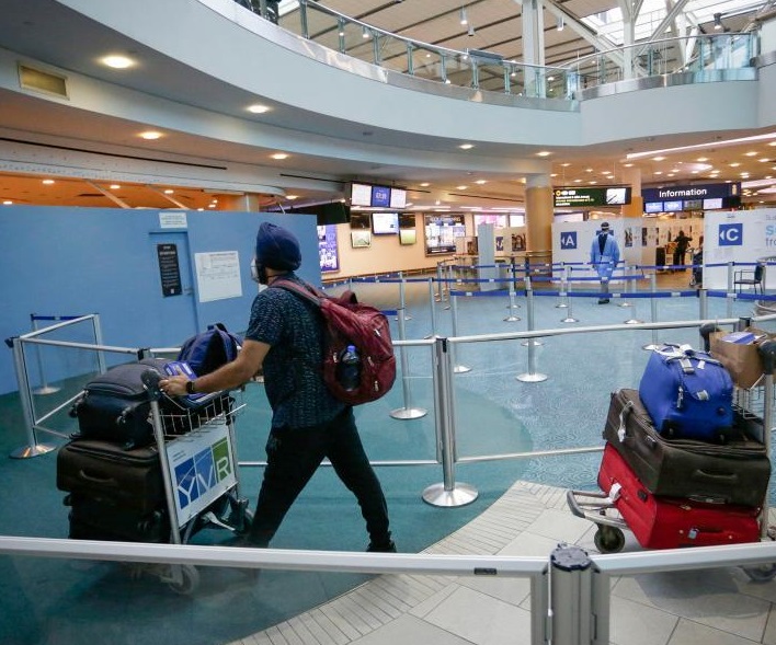 4月23日,來自印度的旅客抵達加拿大溫哥華國際機場。