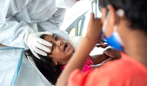 5月10日,在馬來(lái)西亞吉隆坡附近,醫(yī)務(wù)人員為一個(gè)女孩進(jìn)行新冠病毒檢測(cè)取樣。新華社發(fā)(張紋綜 攝)