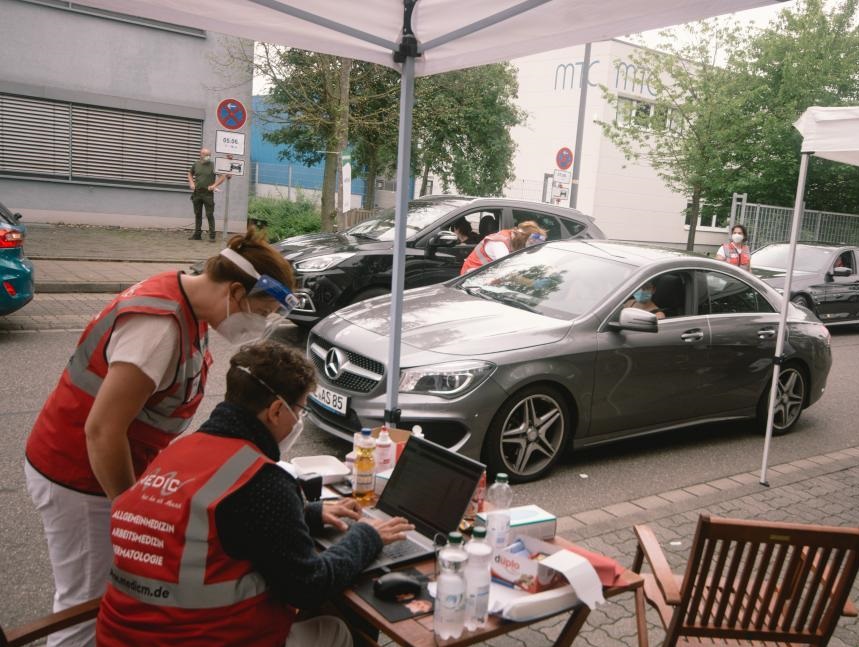 6月5日,德國梅爾布施的工作人員在一處“得來速”式新冠疫苗接種點工作。