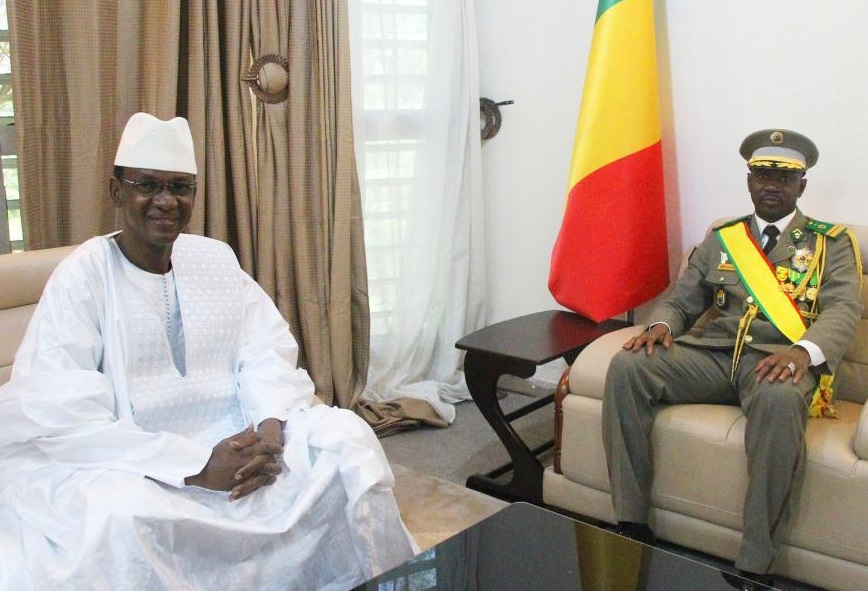 6月7日,馬里過渡總統(tǒng)阿西米·戈伊塔(右)在首都巴馬科會(huì)見喬蓋·科卡拉·馬伊加。