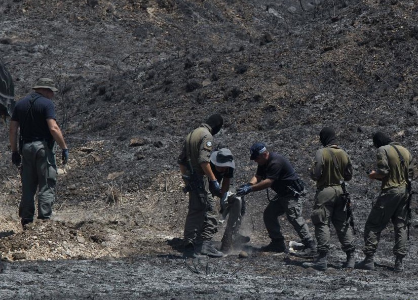 8月4日,在以色列北部謝莫納鎮(zhèn)附近,安全人員處理火箭彈殘骸。