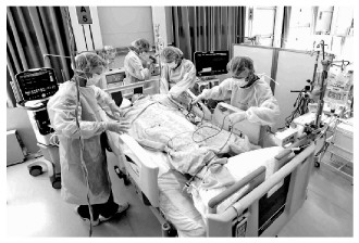 圖為日本大阪一家醫(yī)院的醫(yī)護(hù)人員治療新冠患者。 圖片來源:人民視覺