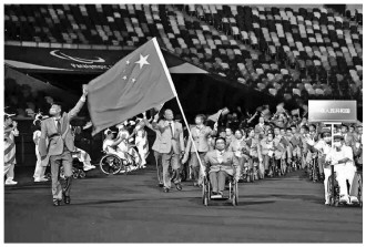 擔任中國代表團旗手的男子田徑運動員王浩天生右小臂殘疾,但他性格樂觀、永不服輸。他在14歲時因出色的身體素質(zhì),成為一名殘疾人運動員。在2013年首次入選殘疾人國家田徑集訓隊后,王浩憑借吃苦耐勞和不服輸?shù)木?,迅速成長為年輕一代中國殘疾人運動員的代表人物。2014年王浩參加仁川亞殘會,一舉獲得男子100米、200米、400米三項金牌,之后他先后奪得2016年里約殘奧會跳遠亞軍、2017年殘疾人田徑世錦賽跳遠冠軍,以及2018年亞殘會包括4×100米接力在內(nèi)的5塊金牌。