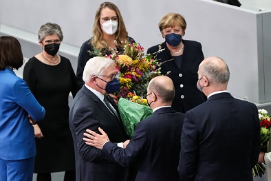 2月13日,在德國首都柏林,施泰因邁爾(中左)接受德國總理朔爾茨祝賀。