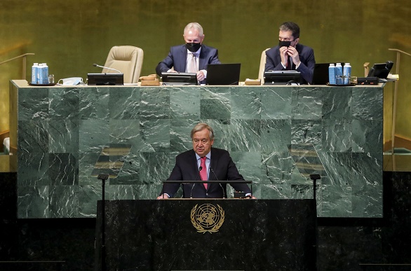 9月20日,在位于紐約的聯(lián)合國(guó)總部,聯(lián)合國(guó)秘書(shū)長(zhǎng)古特雷斯(下)在聯(lián)合國(guó)大會(huì)一般性辯論開(kāi)幕式上講話。 新華社記者 王迎 攝