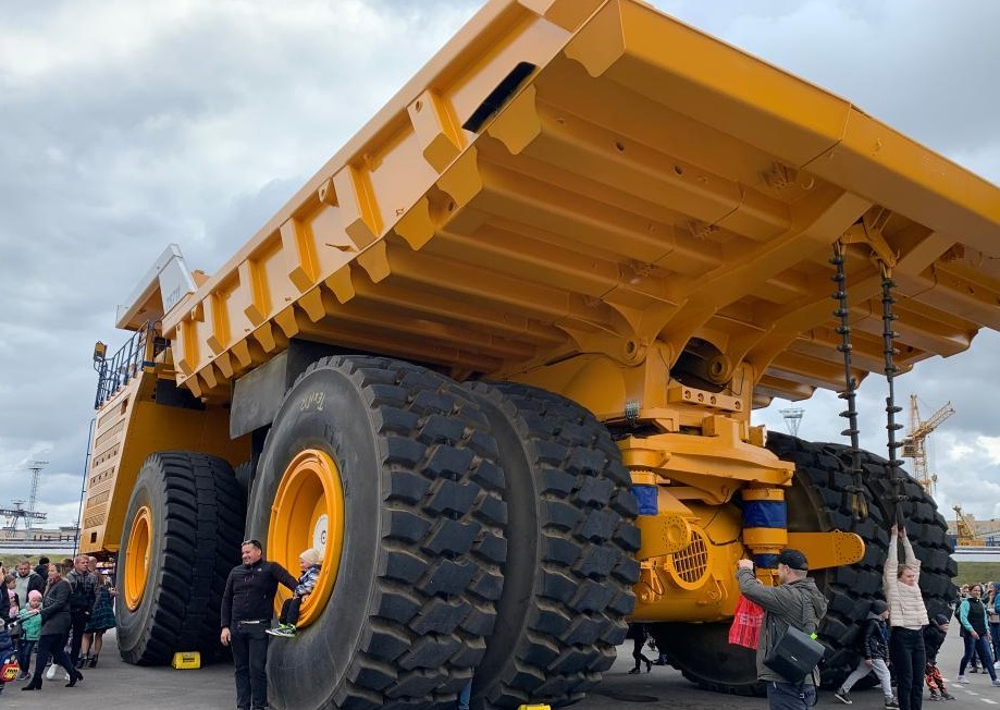 9月24日,市民在白俄羅斯明斯克州若基諾市的白俄羅斯汽車制造廠參觀Belaz75711大型自卸車。