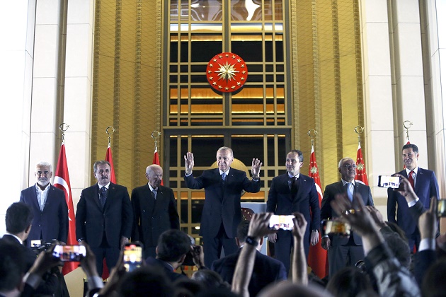 5月29日凌晨,土耳其總統(tǒng)埃爾多安(中)在安卡拉向人們致意。新華社發(fā)(穆斯塔法·卡亞攝)