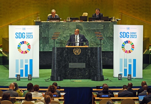 9月18日,在位于紐約的聯(lián)合國總部,第78屆聯(lián)大主席弗朗西斯在聯(lián)合國可持續(xù)發(fā)展目標(biāo)峰會上講話。新華社記者 李睿 攝