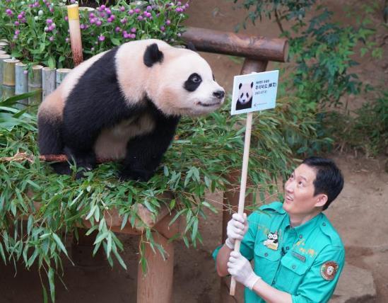 7月7日,在韓國(guó)京畿道龍仁市愛(ài)寶樂(lè)園,大熊貓“輝寶”與飼養(yǎng)員宋永寬互動(dòng)。新華社發(fā)(孫一然攝)