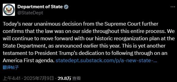 美國國務(wù)院當(dāng)天在社交媒體上發(fā)文說:“我們將繼續(xù)推進(jìn)國務(wù)院的歷史性重組工作。”