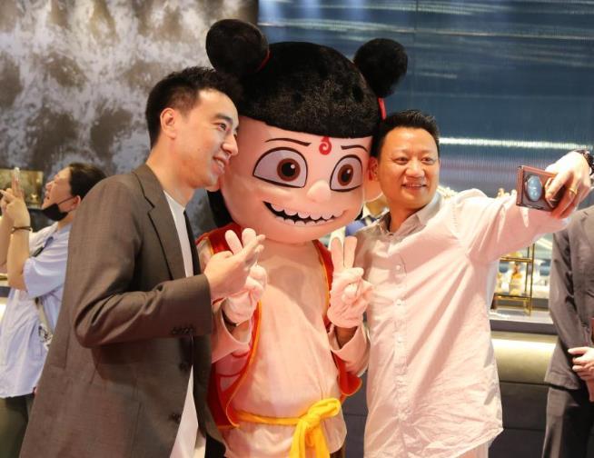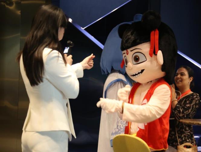 7月15日,在阿聯(lián)酋迪拜的首映儀式現(xiàn)場,人們與《哪吒2》主題人偶互動。新華社記者 溫新年 攝