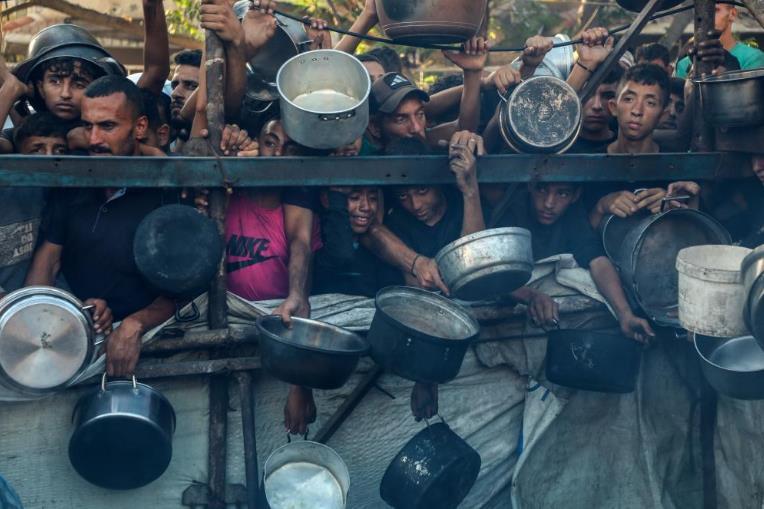 7月20日,在加沙城,當?shù)孛癖姷却I取食物。新華社發(fā)(里澤克·阿卜杜勒賈瓦德攝)