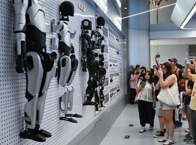 7月29日,美國(guó)飛虎隊(duì)夏令營(yíng)代表團(tuán)成員在湖北省武漢市湖北人形機(jī)器人創(chuàng)新中心參觀。