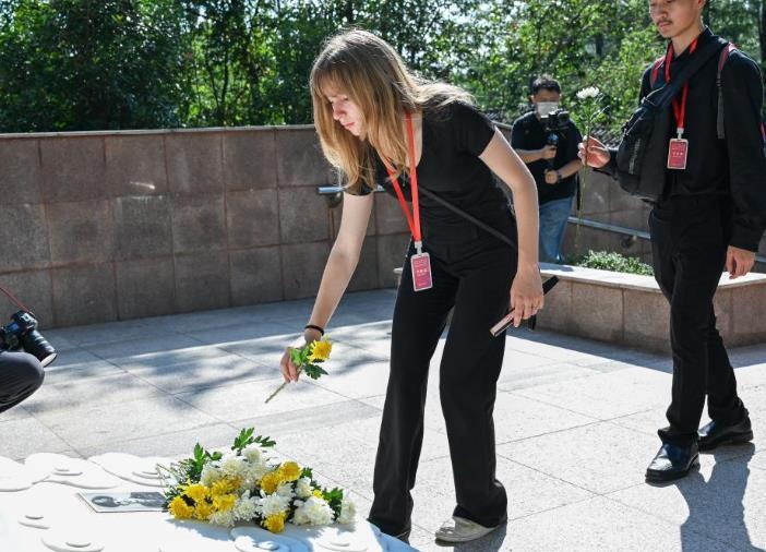 7月28日,在湖北省黃岡市紅安縣,學(xué)生們排隊(duì)在飛虎隊(duì)隊(duì)員格倫·本尼達(dá)墓碑前獻(xiàn)花。