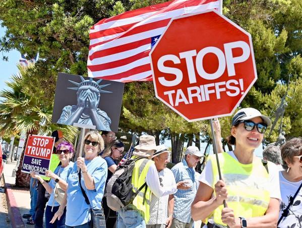 圖為美國民眾在洛杉磯港抗議特朗普關(guān)稅政策。 CFP供圖