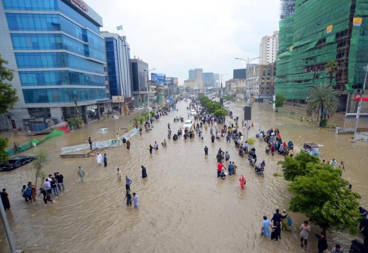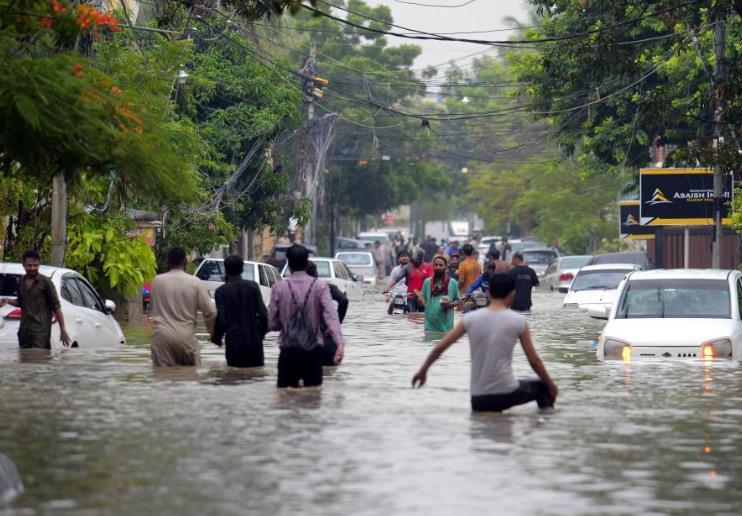 8月19日,在巴基斯坦南部港口城市卡拉奇,當(dāng)?shù)鼐用裨诒┯赀^后涉水出行。新華社發(fā)