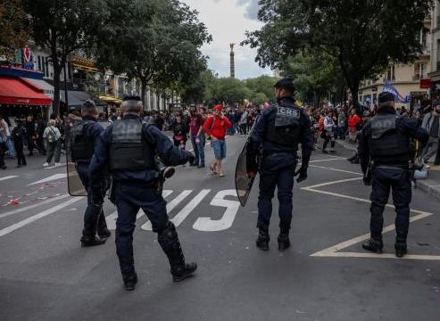 9月10日,警察在法國(guó)巴黎夏特萊廣場(chǎng)附近的游行示威現(xiàn)場(chǎng)警戒。新華社發(fā)(奧雷利安·莫里薩爾攝)