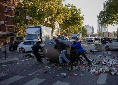9月10日,在法國(guó)巴黎街頭,示威者用垃圾桶封鎖道路。新華社發(fā)(奧雷利安·莫里薩爾攝)