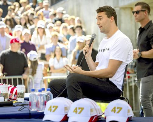 圖為9月10日,查理·柯克在美國猶他州奧勒姆市的猶他山谷大學(xué)遭槍擊前發(fā)表演講。 新華社發(fā)