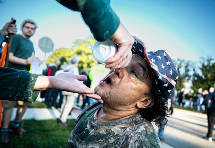 9月26日,在位于美國芝加哥西郊布羅德維尤市的移民與海關(guān)執(zhí)法局辦事機構(gòu)外,執(zhí)法人員發(fā)射的催淚彈傷及一名抗議者,同伴在為他進行緊急處置。新華社發(fā)(文森特·約翰遜攝)