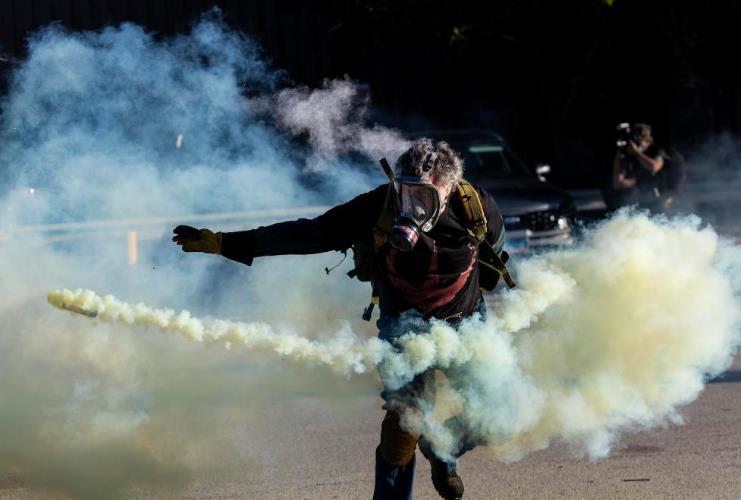 9月26日,在位于美國芝加哥西郊布羅德維尤市的移民與海關(guān)執(zhí)法局辦事機構(gòu)外,抗議者在沖突中將執(zhí)法人員發(fā)射的催淚彈瓶扔回。新華社發(fā)(文森特·約翰遜攝)