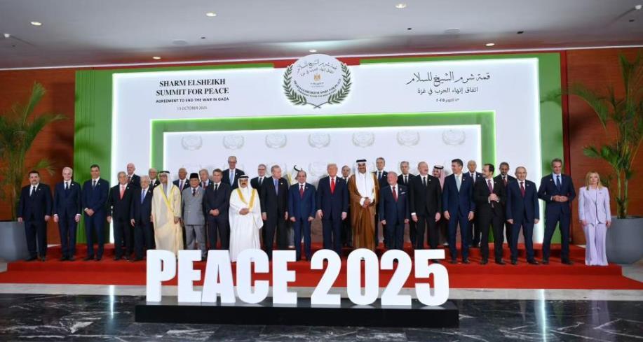 10月13日,在埃及沙姆沙伊赫,與會(huì)領(lǐng)導(dǎo)人在峰會(huì)前集體合影。新華社發(fā)(埃及總統(tǒng)府供圖)