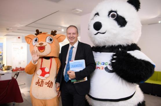嘉賓與熊貓和麋鹿人偶合影。傅永山攝