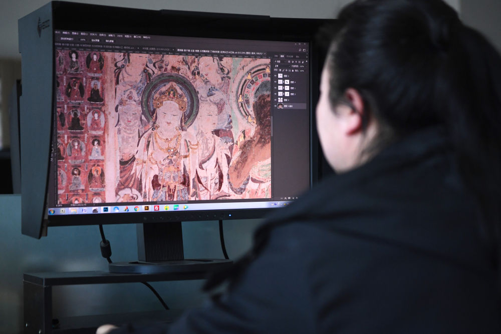 敦煌研究院文物數(shù)字化保護(hù)團(tuán)隊圖像處理人員年海麗在拼接壁畫圖像(2023年4月25日攝)。數(shù)字化探索為莫高窟的保護(hù)與傳承開辟了全新路徑,數(shù)字技術(shù)讓敦煌文物走出洞窟,跨出國門,走向“永久保存、永續(xù)利用”。新華社記者 陳斌 攝