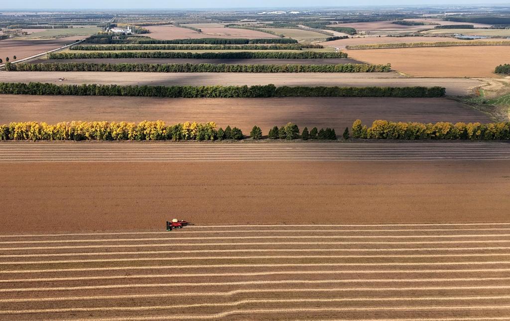 9月23日,在北大荒集團(tuán)黑龍江格球山農(nóng)場(chǎng)有限公司大豆地塊,農(nóng)機(jī)在進(jìn)行收獲作業(yè)(無(wú)人機(jī)照片)。新華社發(fā)(陸文祥攝)