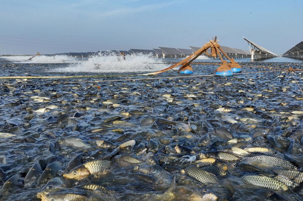 這是河北省唐山市豐南區(qū)黑沿子鎮(zhèn)“漁光一體”現(xiàn)代漁業(yè)產(chǎn)業(yè)園魚(yú)塘內(nèi)場(chǎng)景(無(wú)人機(jī)照片)。新華社記者 楊世堯 攝