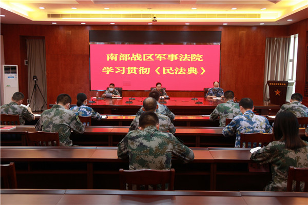 南部戰(zhàn)區(qū)軍事法院召開專題黨委會,認(rèn)真學(xué)習(xí)習(xí)近平主席在中央政治局第二十次集體學(xué)習(xí)時的重要講話、全國法院學(xué)習(xí)貫徹2020年全國兩會精神視頻會議精神和民法典,專題部署推動戰(zhàn)區(qū)兩級軍事法院和轄區(qū)部隊民法典學(xué)習(xí)宣傳貫徹工作,要求戰(zhàn)區(qū)兩級軍事法院在學(xué)習(xí)宣傳貫徹民法典中走在前列,為部隊和官兵樹好標(biāo)桿;準(zhǔn)確理解和把握民法典立法精神、條文含義和最新內(nèi)容,提高運用民法典維護官兵權(quán)益、化解矛盾糾紛、促進部隊和社會和諧穩(wěn)定的能力;把深入宣傳貫徹民法典作為當(dāng)前和今后一個時期的工作重點,在戰(zhàn)區(qū)部隊營造尊法學(xué)法守法用法的濃厚氛圍。